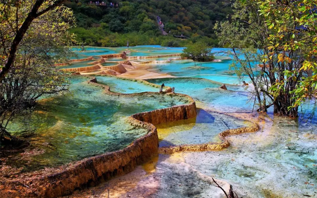迎宾池--飞瀑流辉--洗身洞--金沙铺地--盆景池--石塔镇海--黄龙寺--黄龙洞--五彩池(单程4200米ž半程索道游览线路>>>一种快捷而便利的游览方式。