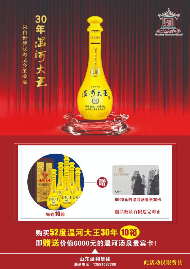 30年温河大王年份酒,采用储藏30年以上的优质五粮原酒,以优质高粱、小麦、糯米、大米、玉米为主要原料,由知名白酒专家李克明教授亲自勾调。口感细腻香醇,五粮香气幽雅,其酒液无色,清澈透明,清芳甘润、细致,入口甜润、醇厚、丰满,尾净悠长,多数人知道,少数人喝到!
