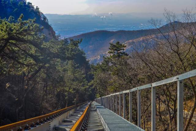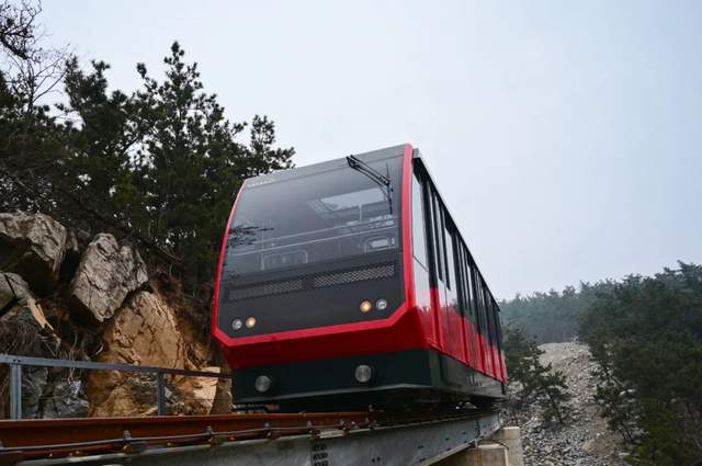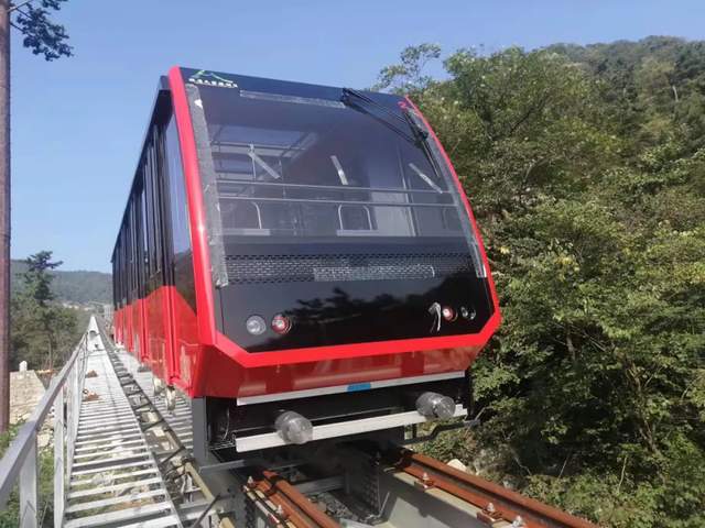 客运缆车的轨道沿山势而建,陡峭之处坡度可达70度左右。乘坐客运缆车在森林之中漫步穿梭,沿途绿波簇拥。列车时而顺山疾驰,部分区域45°以上的倾斜带来的刺激感,如苍龙出海,猛虎下山,势不可挡,山让路,云散开,汽笛一声,早将万重峰峦抛在车后。