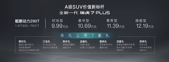 11月7日,全新一代瑞虎7 PLUS正式上市,推出1.6TGDI-7DCT共4款车型,官方指导价9.99万元-12.19万元。